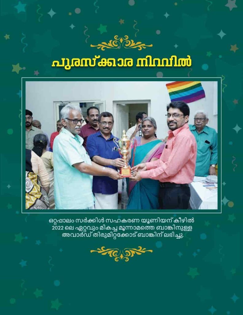 We are delighted to announce that the Thirumittacode Service Co-operative Bank (TSCB) achieved a remarkable feat by securing the Third position in the prestigious “Best Banks in Ottapalam Circle Cooperative Union” awards. This recognition underscores our dedication to excellence and our commitment to providing superior financial services to our valued customers.